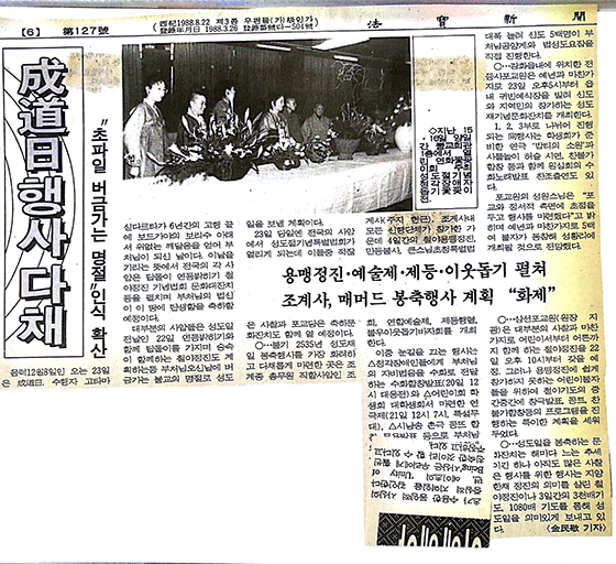 이중 눈길을 끄는 행사는 청각장애인들에게 부처님의 자비법음을 수화로 전달하는 수화합창발표(20일 12시 대웅전)와 어린이회 학생회 대학생회서 마련한 연극제(21일 12시 7시, 특설무대), 시낭송 촌극 꽁트 합창, 무용발표 등으로 부처님의 성도를 축하하는 종하볘술제(22일 12시 7시, 특설무대), 웅변대회(23일 12시 특설무대), 불우이웃돕기바자(20~22일 오전 11~오후 4시 경내), 제등행렬(23일 오후 7시) 등으로 성도이릉 ㄹ부처님오신날에 맞먹는 봉축일로 꾸며 교계의 화제이다.